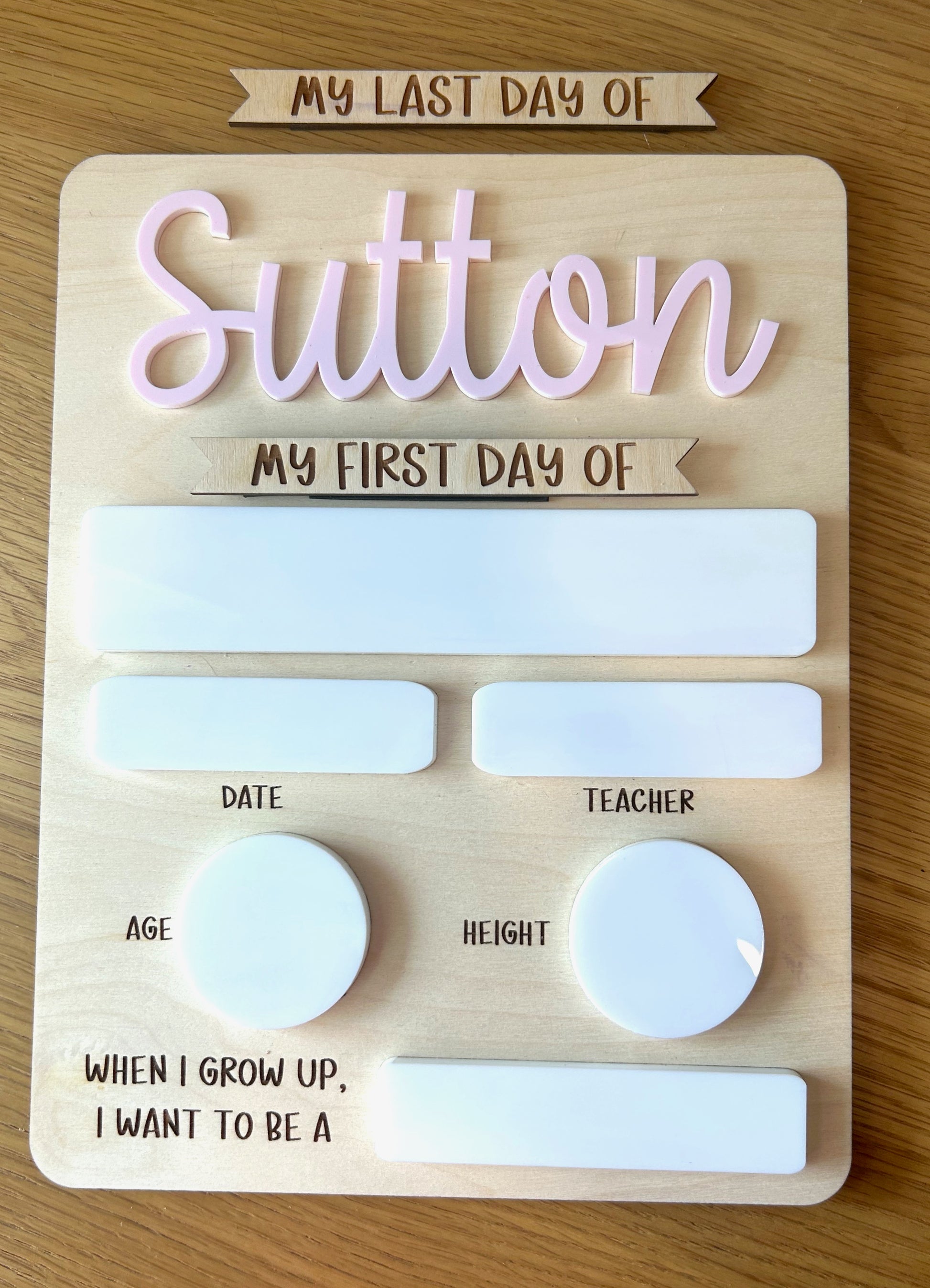 This fun sign can be used for the first/last day of school, or any other activity. Use a white board marker to write down all the important things, then erase to use again! "First Day" and "Last day" signs are interchangeable, held in place by a magnet. Also includes a magnet on the back for storage of your unused piece.