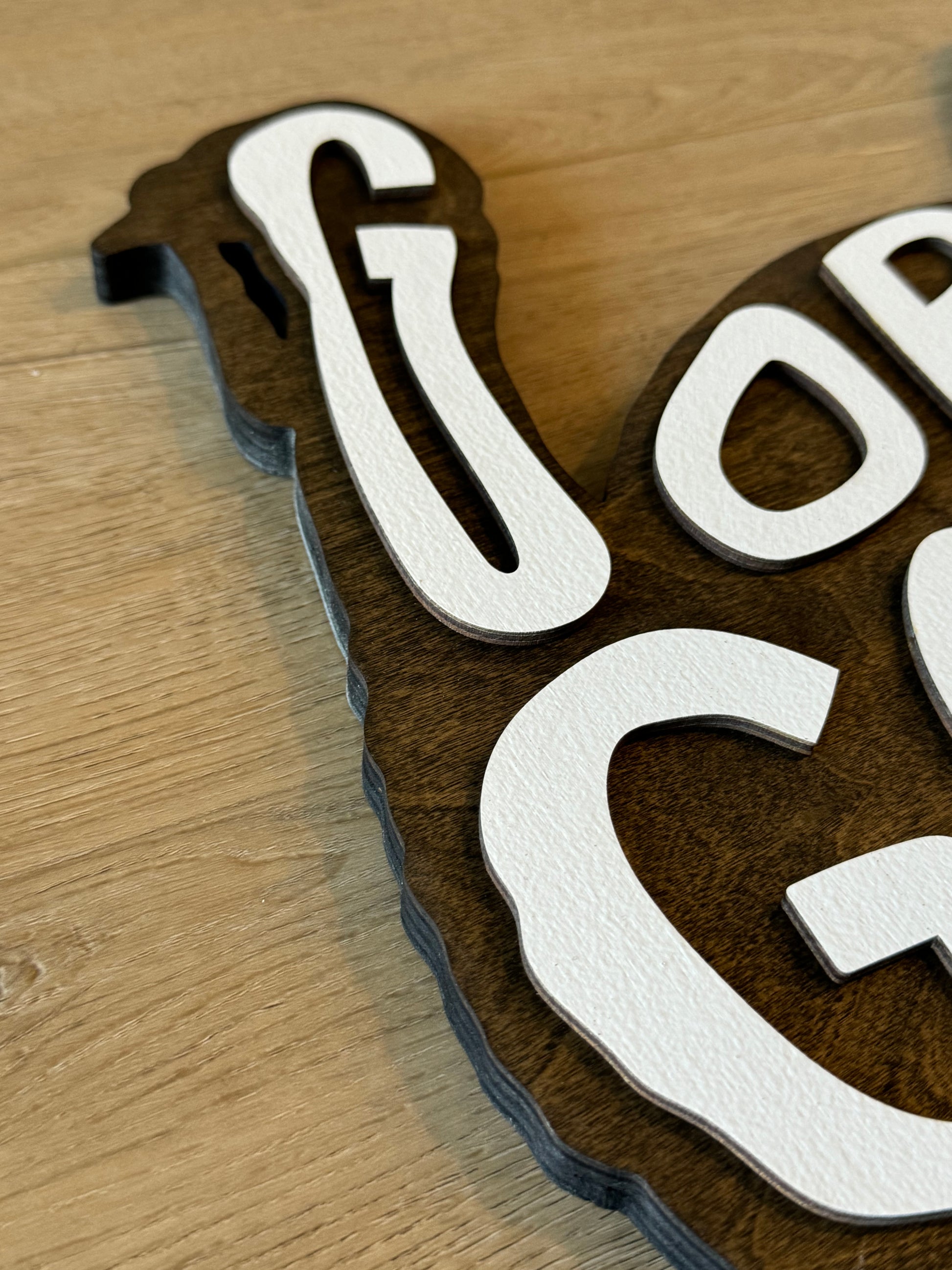 The backer is 1/2" birch plywood with a walnut stain. Design is cut painted 1/8" birch plywood.