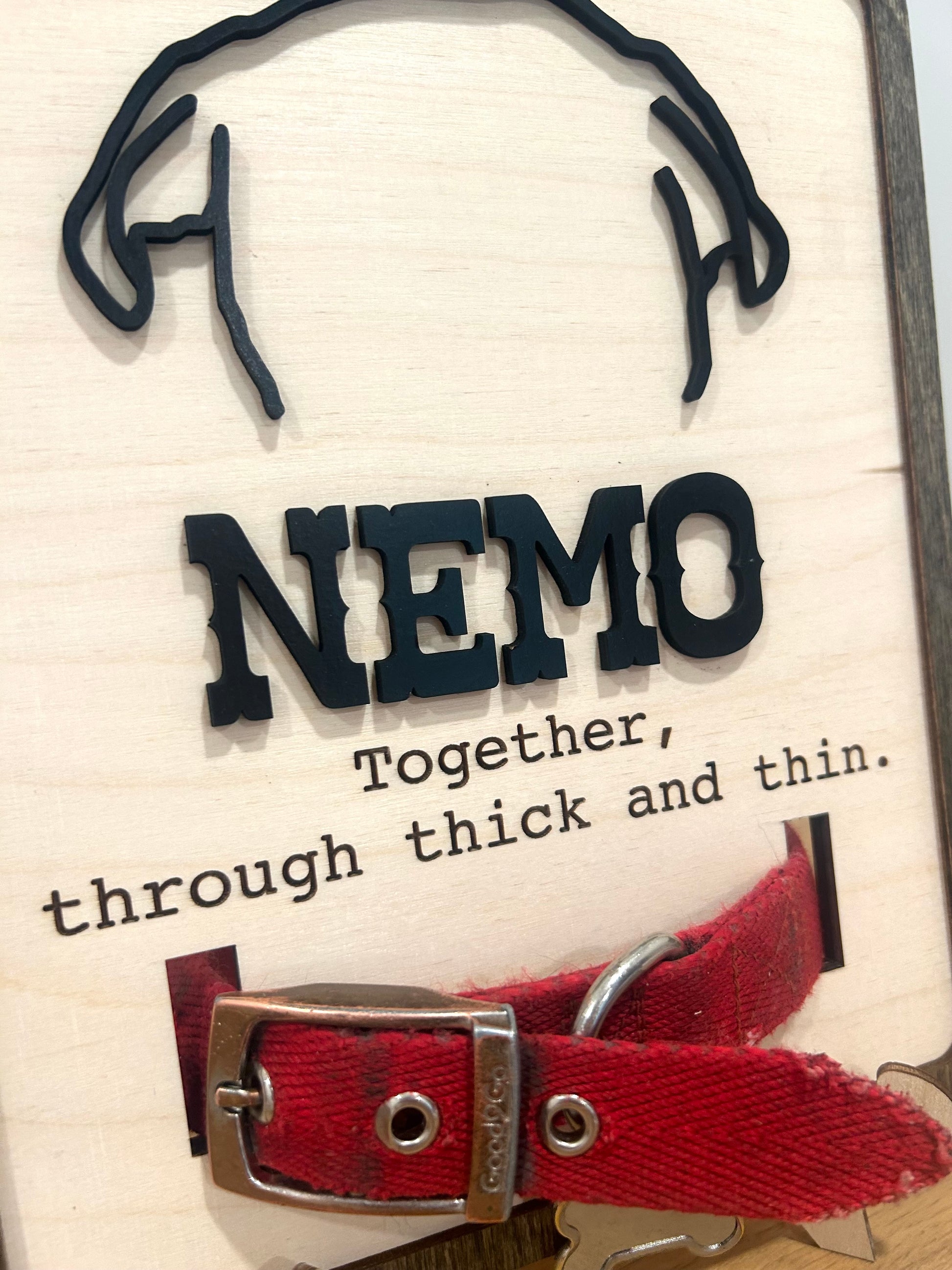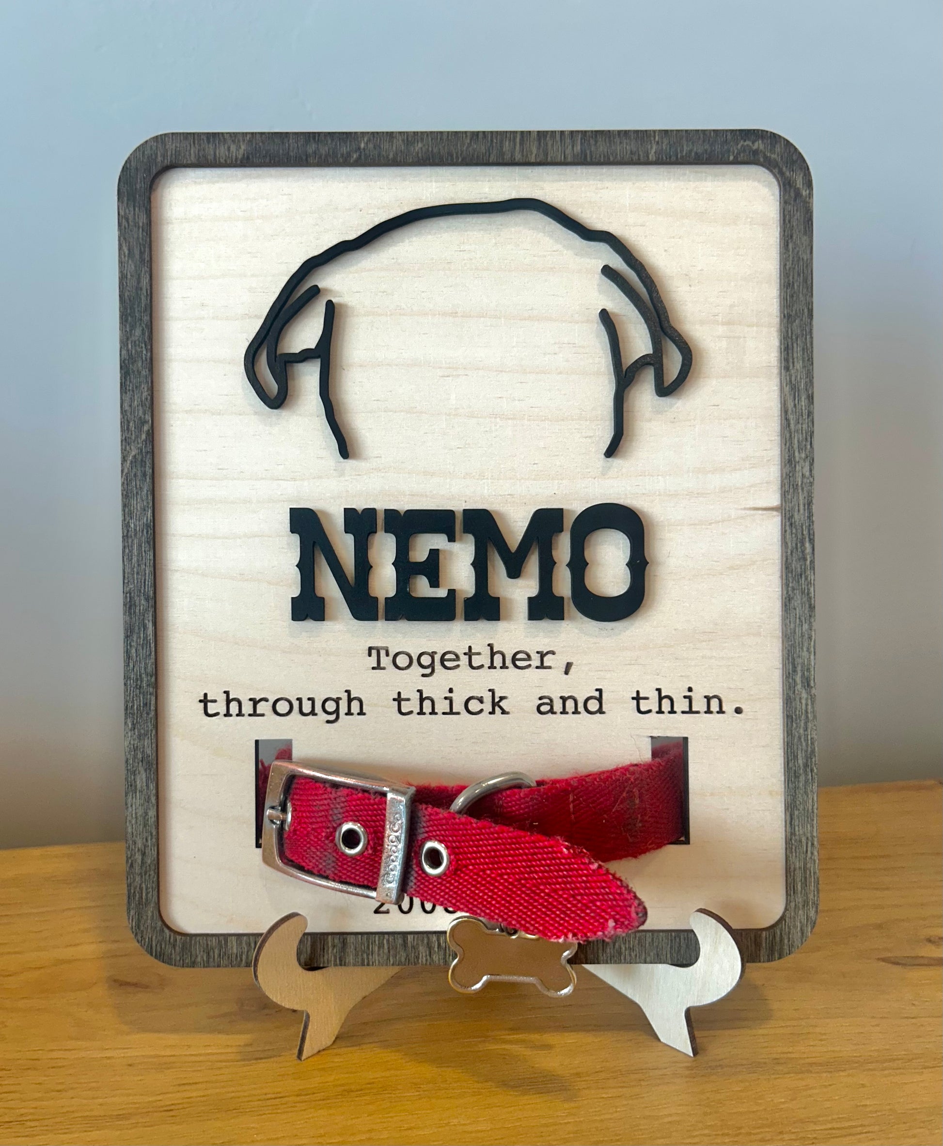Remember your furry loved ones with a personalized sign with collar display. Features a 3D outline of your pet's head, holes to attach collar, and dates of life.