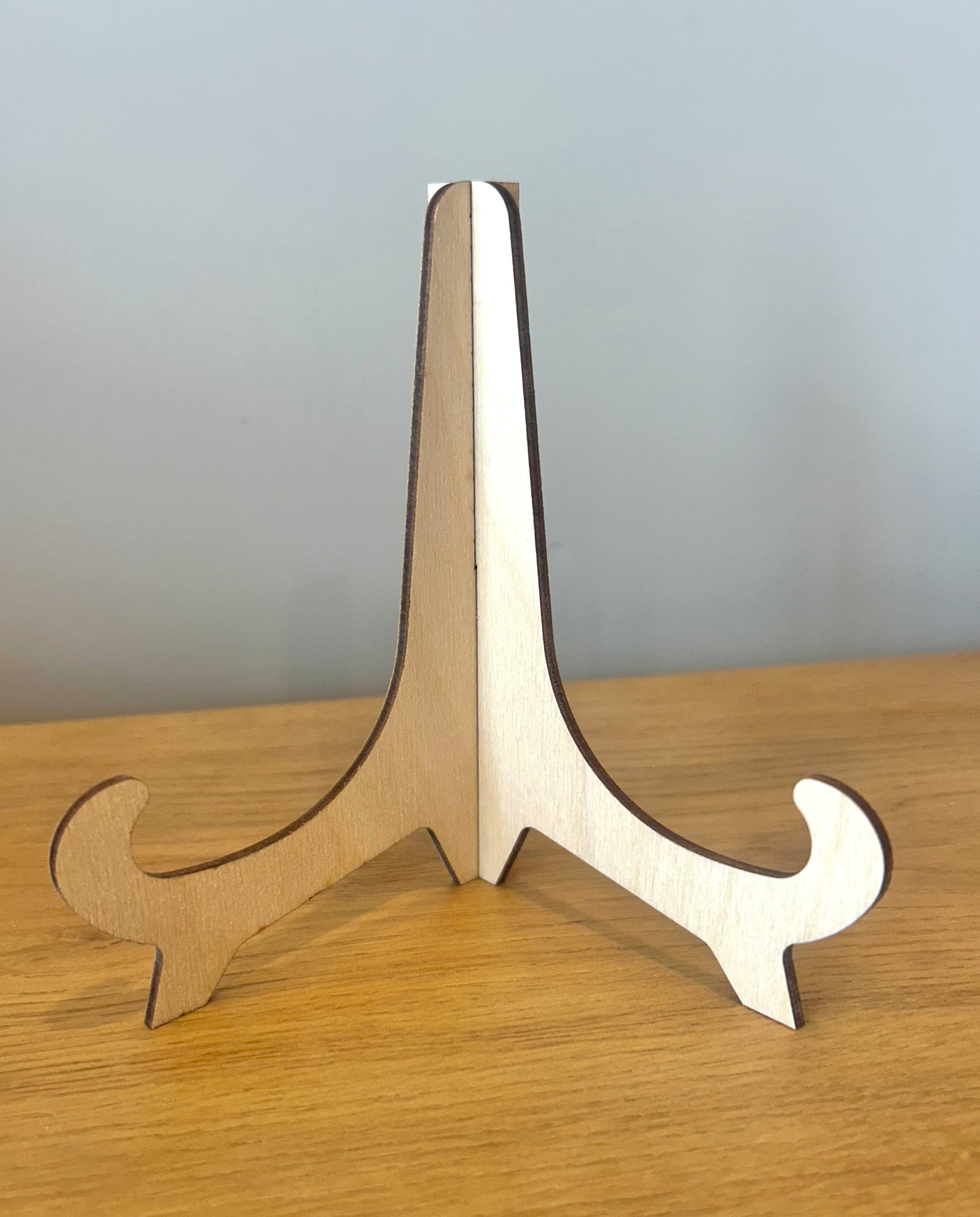 Measures 8" x 9.6". Sign is made out of 1/4" birch plywood with a natural stain, border is 1/8" birch plywood with a walnut stain, black lettering and pet outline. Easel is 1/8" birch plywood.